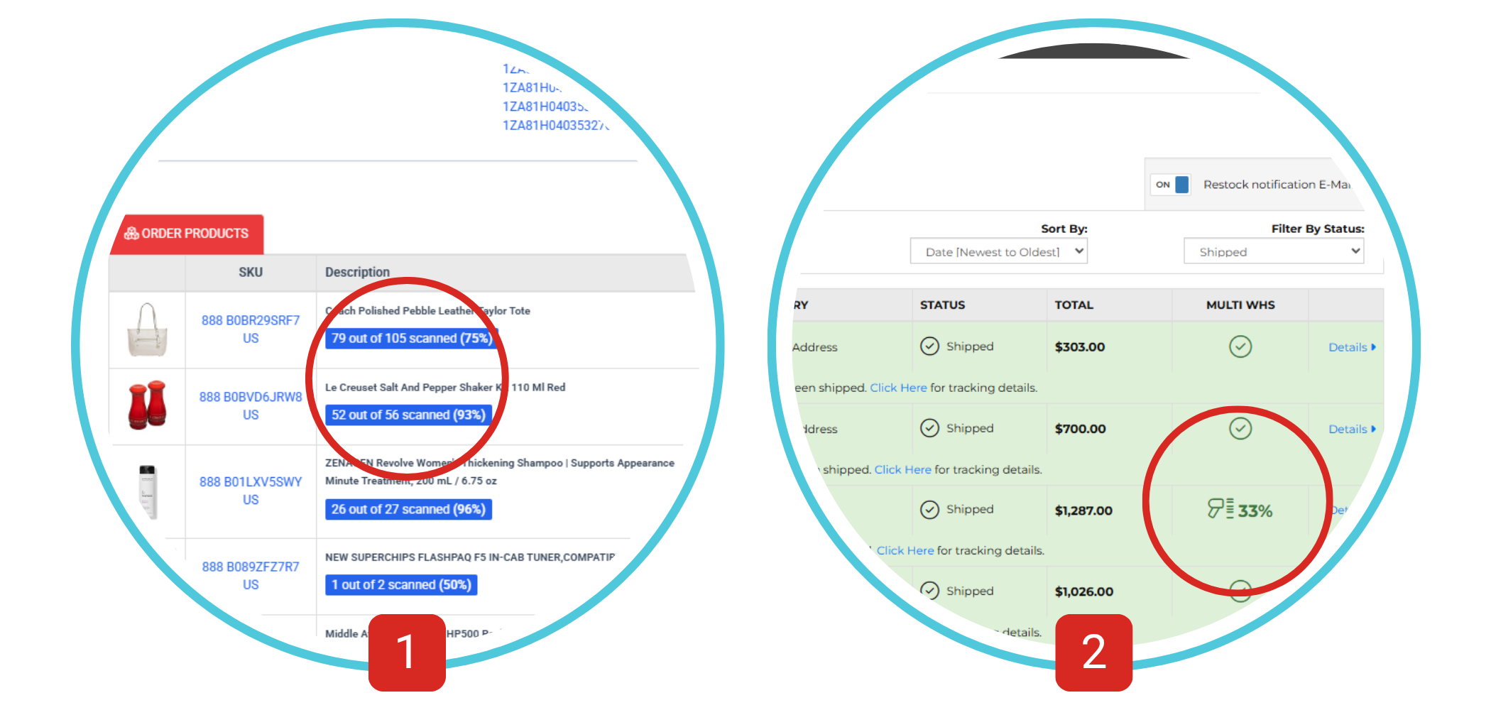 This will give you an information about the scanned inventory percentage of each order, available on both - Orders Listing and Order Details pages.